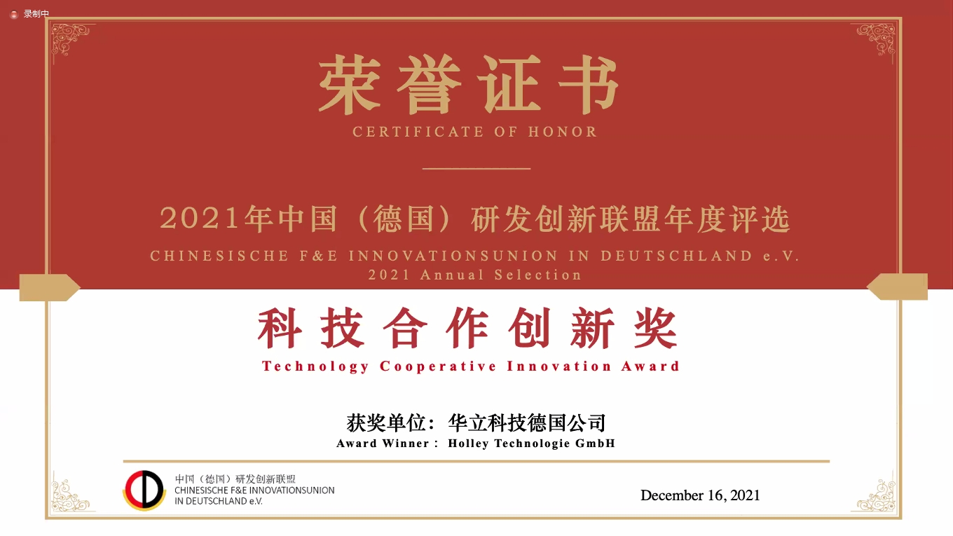 Musi waDecember 16, Chininische F & E anoziva kuDeutschland e.v. akabata its isingasarudzwa yegore negore. Musangano wakapihwa "Technology Unoshanduki Mubairo Mubayiro" ku "Holley Technologie GmbH" Kuti Urumbidze Iyo Kambani Kubudirira Kukura uye Kuisa Chizvarwa chitsva cheGerman einfo smart metres. Holley tekinoroji ine - kudzika kushandira pamwe nemakambani makuru egirini muGermany uye anoshingairira anotora chikamu uye kuongororwa kwemagetsi mita. Iyo Einfo Smart Meter, iyo inokurumidza kutangwazve, inofambisa iyo yakanakira kuisirwa maAcapter uye inogonesa kuunganidzwa kwekukurumidza uye kutapurirana kwedata yemashandisirwo emamiriro ekushandisa akasiyana.